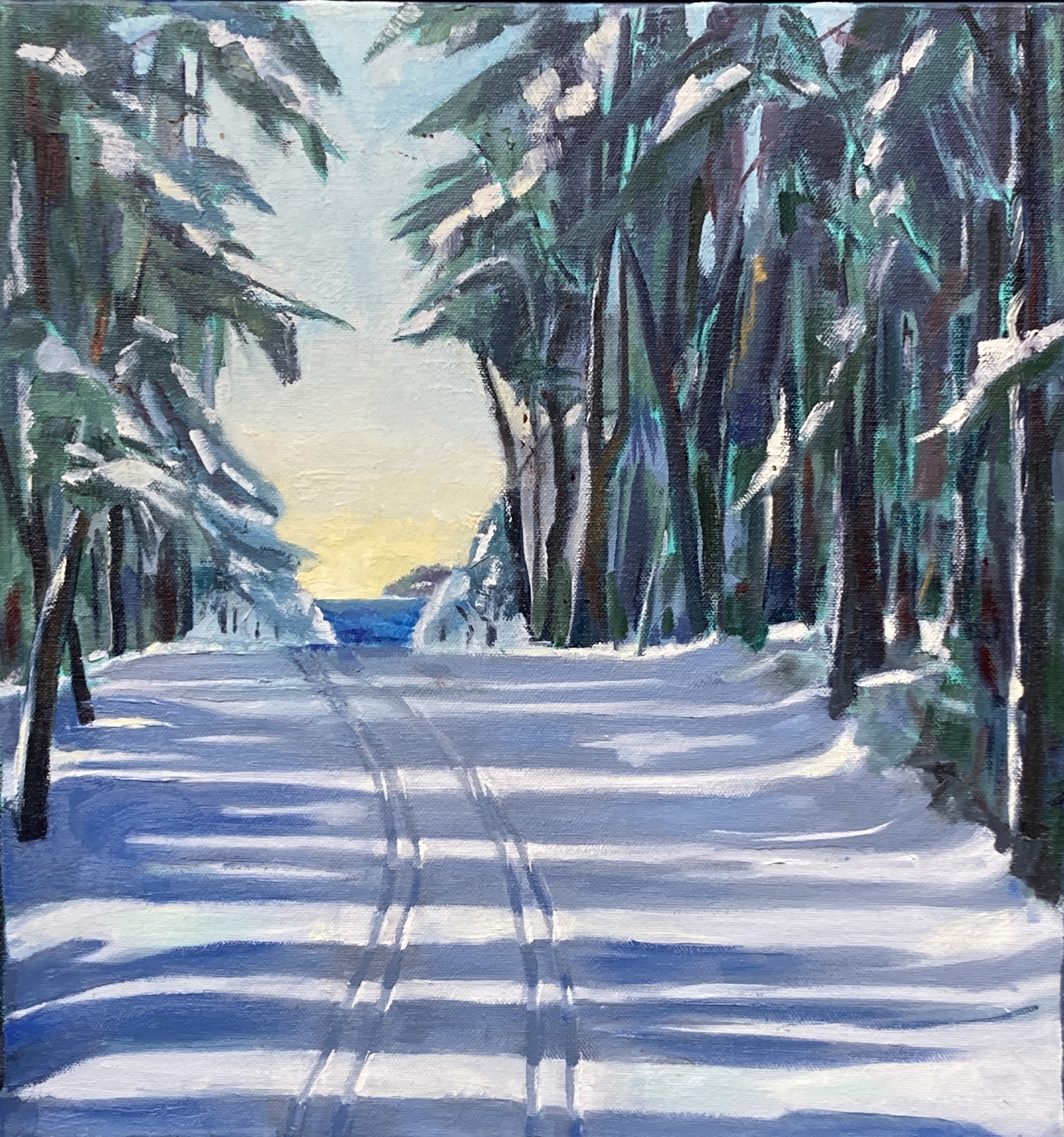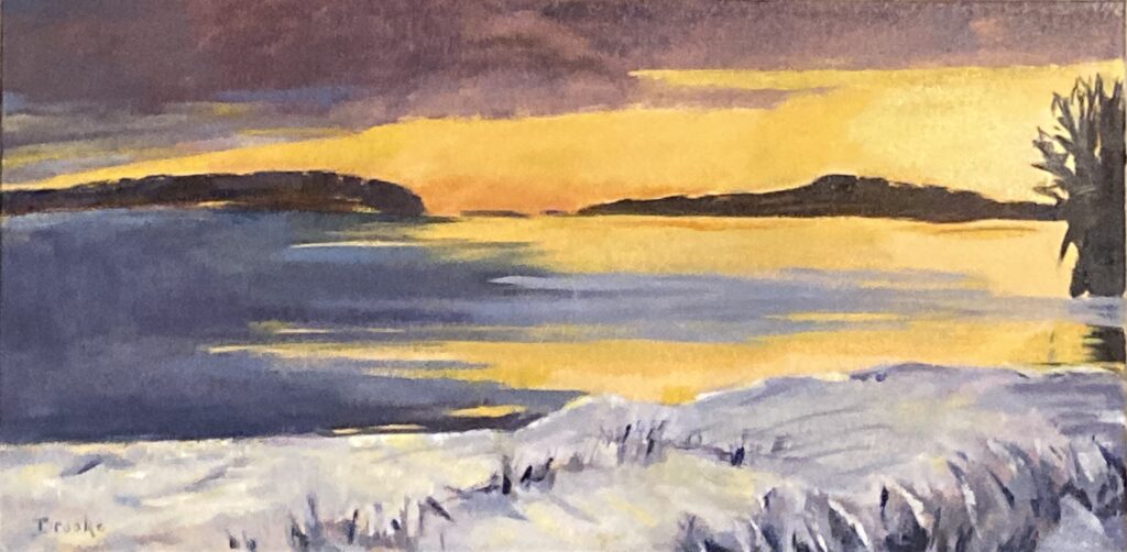 Hope On the Horizon 12 x 24 oil on canvas $465New Snow 16 x 16 oil on canvas $345Reflected Glory 16 x 20 oil on canvas $525The Boathouse 11 x 14 Oil on canvas $345Where Did He Go? 12 x 24 oil on canvas $425Little Gem 11 x 14 oil on canvas. $425Mariner’s Evening 16 x 20 oil on canvas, $335Underway 12 x 24 oil on canvas. $385Champlain Island December #3 11x 14 oil on canvas. Private collectionChamplain Island December 11 x 14 oil on canvas. Private collectionChamplain Island December #2 11 x 14 oil on canvas. Private collectionn“Gone Fishing” 16 x 20 oil on canvas. SoldRounding Pumpkin Island 12 x 12 oil on canvas SoldFrom the Bridge 16 x 16 oil o canvas Sold“Conversation” 12 x 12 oil on canvas. Painter’s collectionThe Red House 12 x 12 oil on canvas SoldEasy Street Basin 16 x 16 oil on canvas. SoldLight Before Rain 12 x 24 oil on canvas Painter’s collection.Message in Island Skies 12 x 24 oil on canvas $425